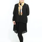 小ぶりなスクエアサイズで、アスコットタイのようにシャツやブラウスの中におさめて使うこともできます。室内でも巻いたままでいられるので使いやすくなっています。