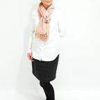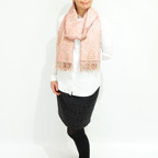 スタンダードな大判サイズで、首に巻くことはもちろん、室内でのひざ掛けにも、肩から羽織る使い方もできます。特に羽織りは、パッと華やかにエレガントな雰囲気に変わります。上半身を覆えるので、着ている服を気にせず合わせることができます。忙しい朝もコーディネートを気にする必要はありません。