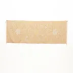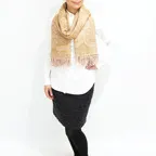 スタンダードな大判サイズで、首に巻くことはもちろん、室内でのひざ掛けにも、肩から羽織る使い方もできます。特に羽織りは、パッと華やかにエレガントな雰囲気に変わります。上半身を覆えるので、着ている服を気にせず合わせることができます。忙しい朝もコーディネートを気にする必要はありません。