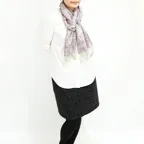 トップスの首元にゆるりと巻けばシンプルな装いも上品な雰囲気に。サイズの小さなハーフタイプで扱いやすくなっています。