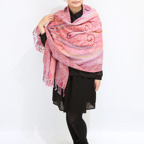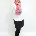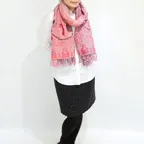 スタンダードな大判サイズで、首に巻くことはもちろん、室内でのひざ掛けにも、肩から羽織る使い方もできます。特に羽織りは、パッと華やかにエレガントな雰囲気に変わります。上半身を覆えるので、着ている服を気にせず合わせることができます。忙しい朝もコーディネートを気にする必要はありません。