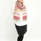 スタンダードな大判サイズで、首に巻くことはもちろん、室内でのひざ掛けにも、肩から羽織る使い方もできます。特に羽織りは、パッと華やかにエレガントな雰囲気に変わります。上半身を覆えるので、着ている服を気にせず合わせることができます。忙しい朝もコーディネートを気にする必要はありません。