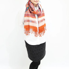 スタンダードな大判サイズで、首に巻くことはもちろん、室内でのひざ掛けにも、肩から羽織る使い方もできます。特に羽織りは、パッと華やかにエレガントな雰囲気に変わります。上半身を覆えるので、着ている服を気にせず合わせることができます。忙しい朝もコーディネートを気にする必要はありません。