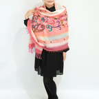 暖かく華やかなお出かけストール。立体感のある刺繍とレイヤード生地、鮮やかな色使いで、首元に華やかなアクセントをもたらします。