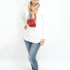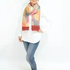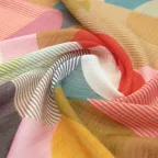 風のように軽くなめらかな薄手のストール。カラフルなドット&幾何学柄でゆるっと巻くだけでアクセント効果が高くなっています。