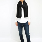 215cm×105cmの大判ショールサイズで、巻きでも羽織でもどちらも使いやすいストールです。首に巻くと程よいボリューム感を出すことができ、小顔効果も期待できます。