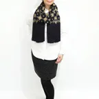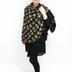 195cm×100cm大判ショールサイズで、巻きでも羽織でもどちらも使いやすいストールです。特に羽織は全面に施された刺繍が美しく輝き、サッとあしらうだけでゴージャスな雰囲気に変化します。横幅が特に長いのでドレスや着物などの羽織物としても重宝します。