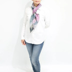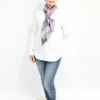 88cm×88cmの大判スカーフで、首元のアクセントに最適。アスコットタイのようにシャツやブラウスの中におさめて使うこともできますし、対角で畳んで肩から羽織ることもできます。また、身につけるだけでなく、手持ちのバッグにキュッと結べるアクセサリーとしても重宝します。
