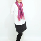 スタンダートな大判サイズで巻いても羽織っても、どちらも使いやすいタイプです。特に羽織は全体の印象がパッと華やかに、エレガントな雰囲気に変化します。