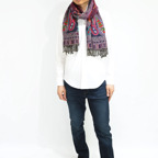 スタンダードな大判サイズで、首に巻くことはもちろん、室内でのひざ掛けにも、肩から羽織る使い方もできます。特に羽織りは、パッと華やかにエレガントな雰囲気に変わります。上半身を覆えるので、着ている服を気にせず合わせることができます。忙しい朝もコーディネートを気にする必要はありません。