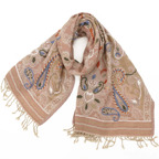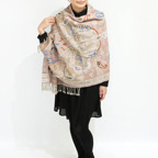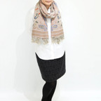 スタンダードな大判サイズで、首に巻くことはもちろん、室内でのひざ掛けにも、肩から羽織る使い方もできます。特に羽織りは、パッと華やかにエレガントな雰囲気に変わります。上半身を覆えるので、着ている服を気にせず合わせることができます。忙しい朝もコーディネートを気にする必要はありません。
