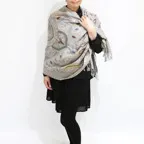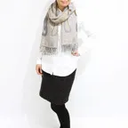 スタンダードな大判サイズで、首に巻くことはもちろん、室内でのひざ掛けにも、肩から羽織る使い方もできます。特に羽織りは、パッと華やかにエレガントな雰囲気に変わります。上半身を覆えるので、着ている服を気にせず合わせることができます。忙しい朝もコーディネートを気にする必要はありません。