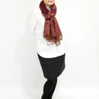 スタンダードな大判サイズで、首に巻くことはもちろん、室内でのひざ掛けにも、肩から羽織る使い方もできます。特に羽織りは、パッと華やかにエレガントな雰囲気に変わります。上半身を覆えるので、着ている服を気にせず合わせることができます。忙しい朝もコーディネートを気にする必要はありません。