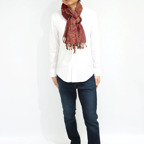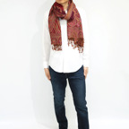 スタンダードな大判サイズで、首に巻くことはもちろん、室内でのひざ掛けにも、肩から羽織る使い方もできます。特に羽織りは、パッと華やかにエレガントな雰囲気に変わります。上半身を覆えるので、着ている服を気にせず合わせることができます。忙しい朝もコーディネートを気にする必要はありません。