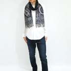 スタンダードな大判サイズで、首に巻くことはもちろん、室内でのひざ掛けにも、肩から羽織る使い方もできます。特に羽織りは、パッと華やかにエレガントな雰囲気に変わります。上半身を覆えるので、着ている服を気にせず合わせることができます。忙しい朝もコーディネートを気にする必要はありません。