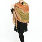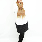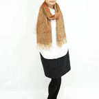 スタンダードな大判サイズで、首に巻くことはもちろん、室内でのひざ掛けにも、肩から羽織る使い方もできます。特に羽織りは、パッと華やかにエレガントな雰囲気に変わります。上半身を覆えるので、着ている服を気にせず合わせることができます。忙しい朝もコーディネートを気にする必要はありません。