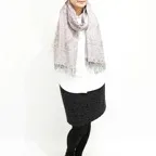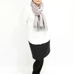 スタンダードな大判サイズで、首に巻くことはもちろん、室内でのひざ掛けにも、肩から羽織る使い方もできます。特に羽織りは、パッと華やかにエレガントな雰囲気に変わります。上半身を覆えるので、着ている服を気にせず合わせることができます。忙しい朝もコーディネートを気にする必要はありません。