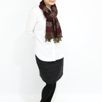 スタンダードな大判サイズで、首に巻くことはもちろん、室内でのひざ掛けにも、肩から羽織る使い方もできます。特に羽織りは、パッと華やかにエレガントな雰囲気に変わります。上半身を覆えるので、着ている服を気にせず合わせることができます。忙しい朝もコーディネートを気にする必要はありません。