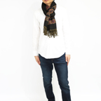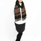 スタンダードな大判サイズで、首に巻くことはもちろん、室内でのひざ掛けにも、肩から羽織る使い方もできます。特に羽織りは、パッと華やかにエレガントな雰囲気に変わります。上半身を覆えるので、着ている服を気にせず合わせることができます。忙しい朝もコーディネートを気にする必要はありません。