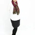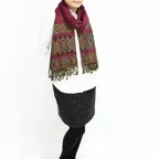 スタンダードな大判サイズで、首に巻くことはもちろん、室内でのひざ掛けにも、肩から羽織る使い方もできます。特に羽織りは、パッと華やかにエレガントな雰囲気に変わります。上半身を覆えるので、着ている服を気にせず合わせることができます。忙しい朝もコーディネートを気にする必要はありません。
