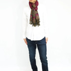 スタンダードな大判サイズで、首に巻くことはもちろん、室内でのひざ掛けにも、肩から羽織る使い方もできます。特に羽織りは、パッと華やかにエレガントな雰囲気に変わります。上半身を覆えるので、着ている服を気にせず合わせることができます。忙しい朝もコーディネートを気にする必要はありません。