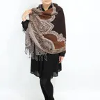 スタンダードな大判サイズで、首に巻くことはもちろん、室内でのひざ掛けにも、肩から羽織る使い方もできます。特に羽織りは、パッと華やかにエレガントな雰囲気に変わります。上半身を覆えるので、着ている服を気にせず合わせることができます。忙しい朝もコーディネートを気にする必要はありません。