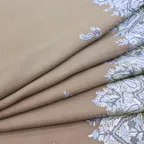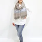 192cm×102cm大判ショールサイズで、巻きでも羽織でもどちらも使いやすいストールです。特に羽織は全面に施された刺繍が美しく輝き、サッとあしらうだけでゴージャスな雰囲気に変化します。横幅が特に長いのでドレスや着物などの羽織物としても重宝します。