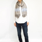 192cm×102cm大判ショールサイズで、巻きでも羽織でもどちらも使いやすいストールです。特に羽織は全面に施された刺繍が美しく輝き、サッとあしらうだけでゴージャスな雰囲気に変化します。横幅が特に長いのでドレスや着物などの羽織物としても重宝します。