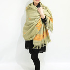 192cm×102cm大判ショールサイズで、巻きでも羽織でもどちらも使いやすいストールです。特に羽織は全面に施された刺繍が美しく輝き、サッとあしらうだけでゴージャスな雰囲気に変化します。横幅が特に長いのでドレスや着物などの羽織物としても重宝します。
