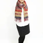 スタンダードな大判サイズで、首に巻くことはもちろん、室内でのひざ掛けにも、肩から羽織る使い方もできます。特に羽織りは、パッと華やかにエレガントな雰囲気に変わります。上半身を覆えるので、着ている服を気にせず合わせることができます。忙しい朝もコーディネートを気にする必要はありません。