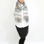 スタンダードな大判サイズで、首に巻くことはもちろん、室内でのひざ掛けにも、肩から羽織る使い方もできます。特に羽織りは、パッと華やかにエレガントな雰囲気に変わります。上半身を覆えるので、着ている服を気にせず合わせることができます。忙しい朝もコーディネートを気にする必要はありません。