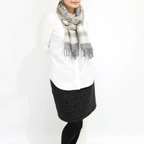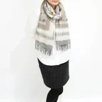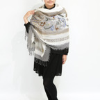 スタンダードな大判サイズで、首に巻くことはもちろん、室内でのひざ掛けにも、肩から羽織る使い方もできます。特に羽織りは、パッと華やかにエレガントな雰囲気に変わります。上半身を覆えるので、着ている服を気にせず合わせることができます。忙しい朝もコーディネートを気にする必要はありません。
