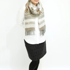 スタンダードな大判サイズで、首に巻くことはもちろん、室内でのひざ掛けにも、肩から羽織る使い方もできます。特に羽織りは、パッと華やかにエレガントな雰囲気に変わります。上半身を覆えるので、着ている服を気にせず合わせることができます。忙しい朝もコーディネートを気にする必要はありません。