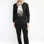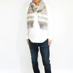 スタンダードな大判サイズで、首に巻くことはもちろん、室内でのひざ掛けにも、肩から羽織る使い方もできます。特に羽織りは、パッと華やかにエレガントな雰囲気に変わります。上半身を覆えるので、着ている服を気にせず合わせることができます。忙しい朝もコーディネートを気にする必要はありません。