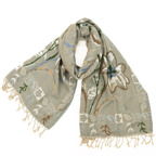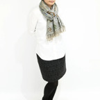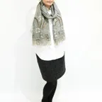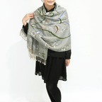 スタンダードな大判サイズで、首に巻くことはもちろん、室内でのひざ掛けにも、肩から羽織る使い方もできます。特に羽織りは、パッと華やかにエレガントな雰囲気に変わります。上半身を覆えるので、着ている服を気にせず合わせることができます。忙しい朝もコーディネートを気にする必要はありません。