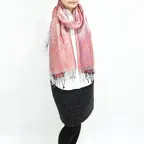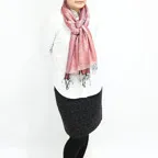 スタンダートな大判サイズで巻いても羽織っても、どちらも使いやすいタイプです。特に羽織は全体の印象がパッと華やかに、エレガントな雰囲気に変化します。