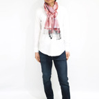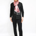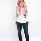 スタンダートな大判サイズで巻いても羽織っても、どちらも使いやすいタイプです。特に羽織は全体の印象がパッと華やかに、エレガントな雰囲気に変化します。