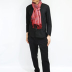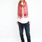 スタンダートな大判サイズで巻いても羽織っても、どちらも使いやすいタイプです。特に羽織は全体の印象がパッと華やかに、エレガントな雰囲気に変化します。