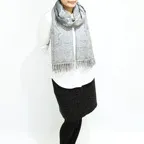 スタンダードな大判サイズで、首に巻くことはもちろん、室内でのひざ掛けにも、肩から羽織る使い方もできます。特に羽織りは、パッと華やかにエレガントな雰囲気に変わります。上半身を覆えるので、着ている服を気にせず合わせることができます。忙しい朝もコーディネートを気にする必要はありません。