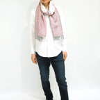 スタンダードな大判サイズで、首に巻くことはもちろん、室内でのひざ掛けにも、肩から羽織る使い方もできます。特に羽織りは、パッと華やかにエレガントな雰囲気に変わります。上半身を覆えるので、着ている服を気にせず合わせることができます。忙しい朝もコーディネートを気にする必要はありません。