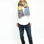 非常に大きなショールサイズで、広げて羽織れば上半身をすっぽりと覆うことができます。縦横の長さも十分にあるため、巻き方の自由度が広がります。程よいボリューム感と立体感を簡単につくることができるため、一巻きでこなれた印象になります。面積もあるので、真夏の室内での冷房対策や膝掛けとしても使いやすくなっています。