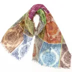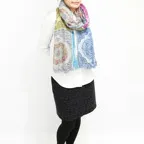 まるでアートのようなグラフィカルなデザイン。多色使いで着回しやすく、巻き方によっても表情を変えやすくなっています。