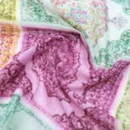 非常に大きなショールサイズで、広げて羽織れば上半身をすっぽりと覆うことができます。縦横の長さも十分にあるため、巻き方の自由度が広がります。程よいボリューム感と立体感を簡単につくることができるため、一巻きでこなれた印象になります。面積もあるので、真夏の室内での冷房対策や膝掛けとしても使いやすくなっています。