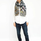 非常に大きなショールサイズで、広げて羽織れば上半身をすっぽりと覆うことができます。縦横の長さも十分にあるため、巻き方の自由度が広がります。程よいボリューム感と立体感を簡単につくることができるため、一巻きでこなれた印象になります。面積もあるので、真夏の室内での冷房対策や膝掛けとしても使いやすくなっています。