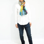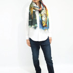 非常に大きなショールサイズで、広げて羽織れば上半身をすっぽりと覆うことができます。縦横の長さも十分にあるため、巻き方の自由度が広がります。程よいボリューム感と立体感を簡単につくることができるため、一巻きでこなれた印象になります。面積もあるので、真夏の室内での冷房対策や膝掛けとしても使いやすくなっています。