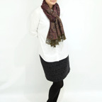 スタンダードな大判サイズで、首に巻くことはもちろん、室内でのひざ掛けにも、肩から羽織る使い方もできます。特に羽織りは、パッと華やかにエレガントな雰囲気に変わります。上半身を覆えるので、着ている服を気にせず合わせることができます。忙しい朝もコーディネートを気にする必要はありません。