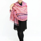 スタンダードな大判サイズで、首に巻くことはもちろん、室内でのひざ掛けにも、肩から羽織る使い方もできます。特に羽織りは、パッと華やかにエレガントな雰囲気に変わります。上半身を覆えるので、着ている服を気にせず合わせることができます。忙しい朝もコーディネートを気にする必要はありません。