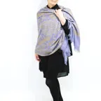 うっとりするようなやわらかさと、ほのかな光沢が魅力のパシュミナ素材。極上素材をさらりとまとう、煌めき仕立ての高級ストールです。