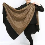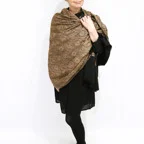 195cm×100cm大判ショールサイズで、巻きでも羽織でもどちらも使いやすいストールです。特に羽織は全面に施された刺繍が美しく輝き、サッとあしらうだけでゴージャスな雰囲気に変化します。横幅が特に長いのでドレスや着物などの羽織物としても重宝します。