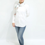 65cm×65cmの小判スカーフで、アスコットタイのようにシャツやブラウスの中におさめて使うこともできます。室内でも巻いたままでいられるので使いやすくなっています。